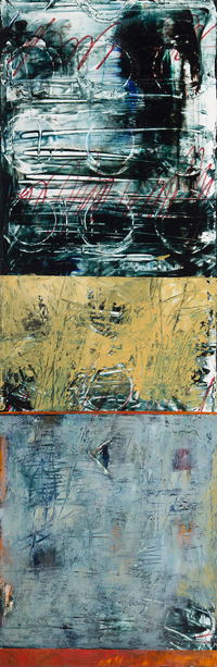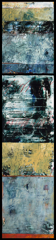 Scratching the surface Diptych -12 x 52 overall Top panel 12 x 16, bottom panel 12 x 36, Acrylic + Mixed Media on Canvas
